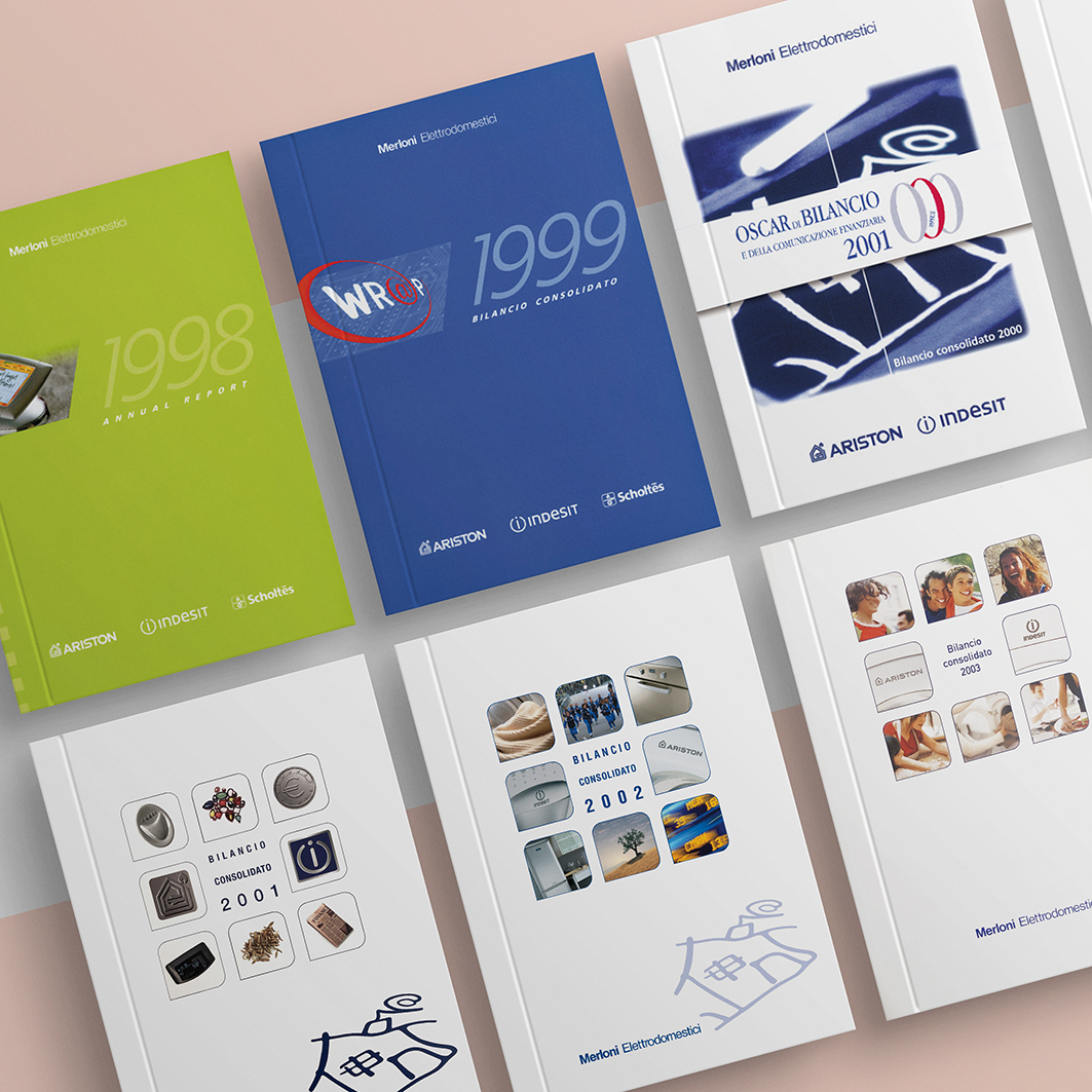 Per anni In Pagina ha curato il progetto grafico e l’impaginazione del bilancio di Merloni Elettrodomestici (Ariston, Indesit), realizzando le versioni in pdf per gli usi online e seguendo la qualità di stampa. Ha supportato la società, inoltre, per pubblicazioni diverse (brochure, pubblicazioni commerciali, ecc.)